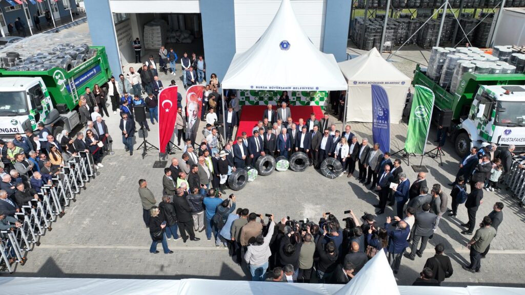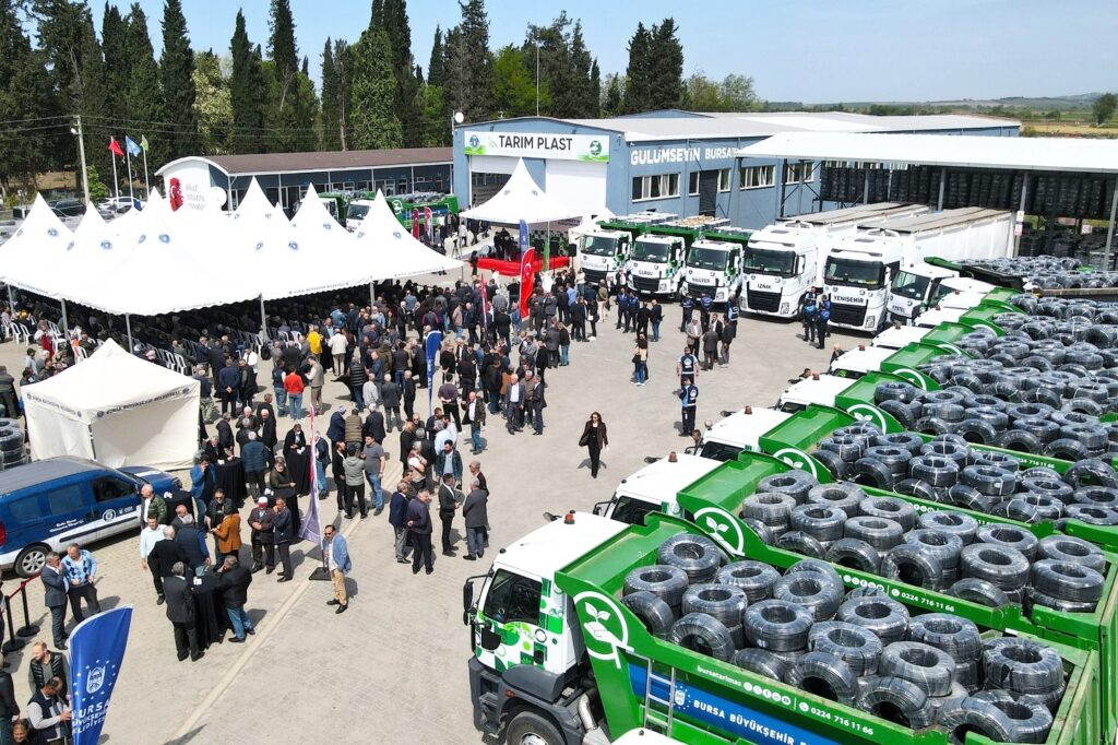 • Bursa Büyükşehir Belediyesi’nin Tarım Peyzaj AŞ yatırımıyla kente kazandırdığı Damla Sulama Boru Üretim Tesisi’nde (Tarım Plast Fabrikası) yüzde 100 geri dönüşüm hammaddesiyle üretilen yaklaşık 10 bin sulama borusu, düzenlenen törenle çiftçilere teslim edildi.