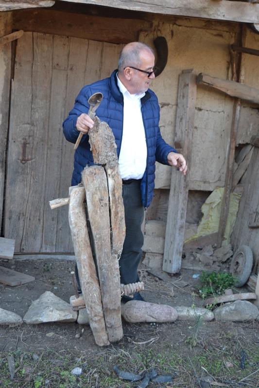 Veysel Uslu’nun evinin bahçesine gittik. Veysel Uslu dedesinin ağaç ustası olduğunu anlattı. Rumeli’den getirdikleri kösele taşı ile bıçak biledi. Ağaç mengene, fıçı ve kaşık yapımında kullanılan aletleri tanıttı. Çift sürerken ve harmanda kullanılan boyundurukları anlattı.