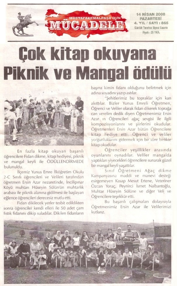 Yunus Emre İlköğretim Okulu 2/C sınıf öğretmeni Ersin Azar, 2007-2008 eğitim-öğretim yılında sınıf öğrencilerini kitap okumaya teşvik etmek için proje tasarlar. “Bu öğretim yılında en çok kitap okuyan öğrencilerle piknik yapıp, fidan dikeceğiz.” diyerek öğrencilere projeyi duyurur.