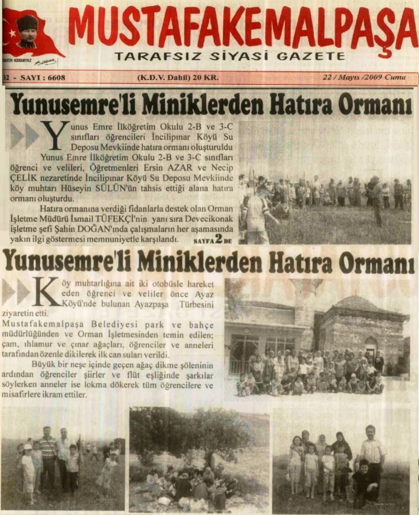 300 fıstık çamı ve meyve fidanı Mustafakemalpaşa Belediyesi ve Orman İşletme Müdürlüğü’nden temin edilir. Etkinliğe Mustafakemalpaşa Belediyesi, Milli Eğitim Müdürlüğü, Orman İşletme Müdürlüğü ve Okul Müdürlüğü katkı sağladı. Büyük bir katılımla fidanlar dikildi, gelenlere lokma ikram edildi. Dikilen fidanlar var fıstık çamı dışında da birkaç tane Akdeniz sediri, badem, meyve fidanı.